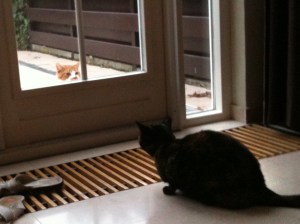 achtertuin te vinden. Mijn kleine grote held op sokjes moet niets van Ollie hebben. Ollie vind het daarentegen prachtig om Noa de stuipen op het lijf te jagen en dan vooral door voor het raam naar Noa te staren terwijl ze op het “wildrooster” ligt te slapen. Ze kunnen minuten lang naar elkaar kijken zonder ook maar een vin te verroeren. Weliswaar met een dik stuk glas er tussen. Het enige wat hoorbaar is, is het klagelijke gemiauw. Ze zijn elkaar twee keer in de haren gevlogen. Maar dat liep met een sisser af. Geen grote plukken haar die door de tuin heen vlogen of happen uit oren.