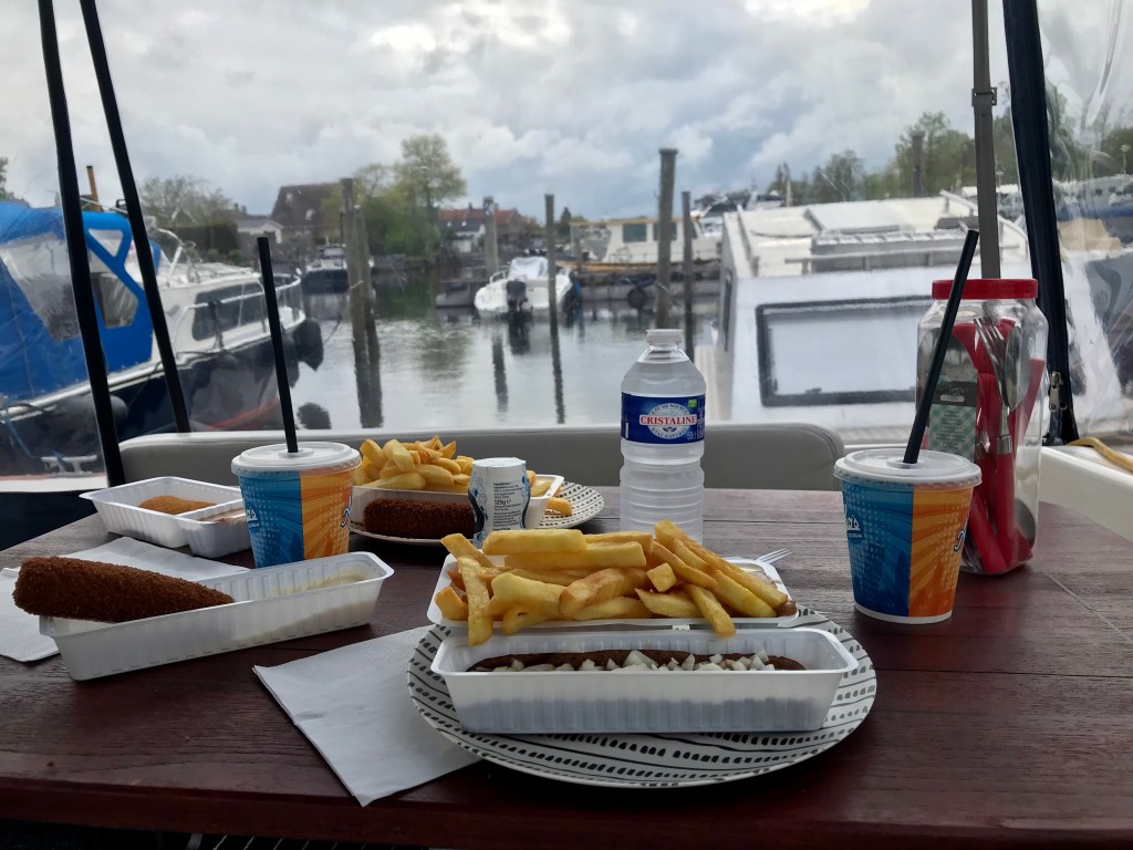 Vanaf de boot zie ik hem alweer aankomen. Waar we in het verleden ook uit eten zijn gegaan, het is nog nooit zo snel opgediend. Misschien komt het door de andere omgeving of door de sfeer. De patat smaakt hier in ieder geval echt heel erg lekker. Het is een combinatie tussen Bramladage en zelfgemaakte frites. Knapperig van buiten, zacht van binnen. En de ordinaire kaassouflee smaakt hemels, om over de saus nog maar niet te spreken.