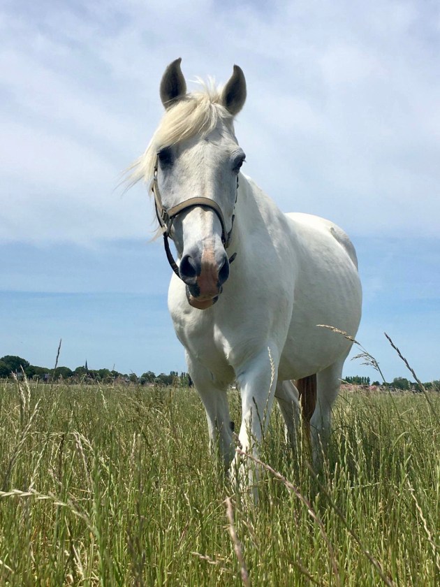 De start van het weideseizoen bracht ons kat nummer drie. En, zo kwamen we later achter, is het zusje van twee. Na wat aarzelende miauwen kwam ze uit het hoge gras tevoorschijn. Een schatje en heel aanhankelijk. Zo erg dat ze met ons mee terug naar stal liep en niet meer is weggegaan. Ze kent de polder op haar duimpje en hobbelt altijd met ons mee. Van stal naar de wei en terug. Voor een wandeling door de polder en zelfs bij een graassessie in het donker op de late avond zit ze als een waakhond naast mij in het gras. Ze is de brutaalste van het stel en bewoont onze “keet” alsof het haar eigen huis is.